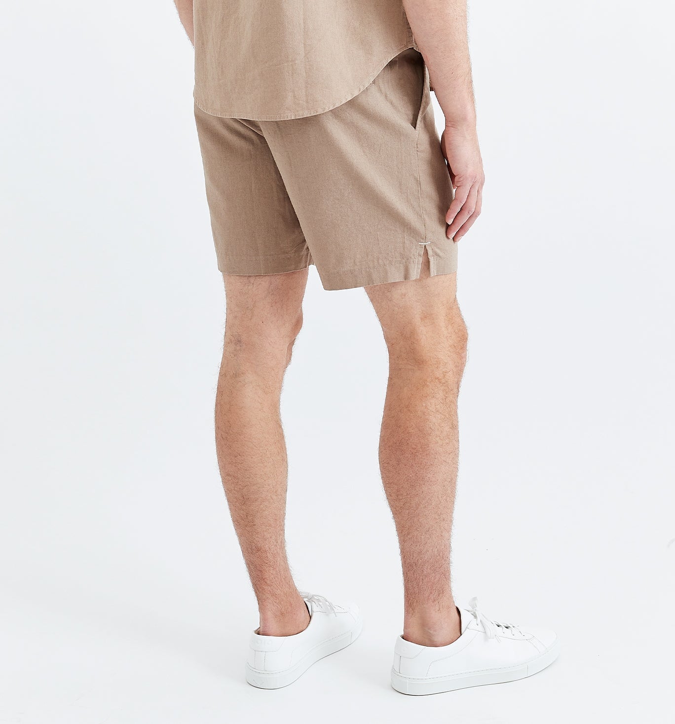 An airy and textured cotton / linen blend short for the warmer months available in the same short style as our stretch cord and twill. Front pockets, secure back pockets, side vents with a contrast bartack and an internal drawcord. Your go-to short for warmer temps.