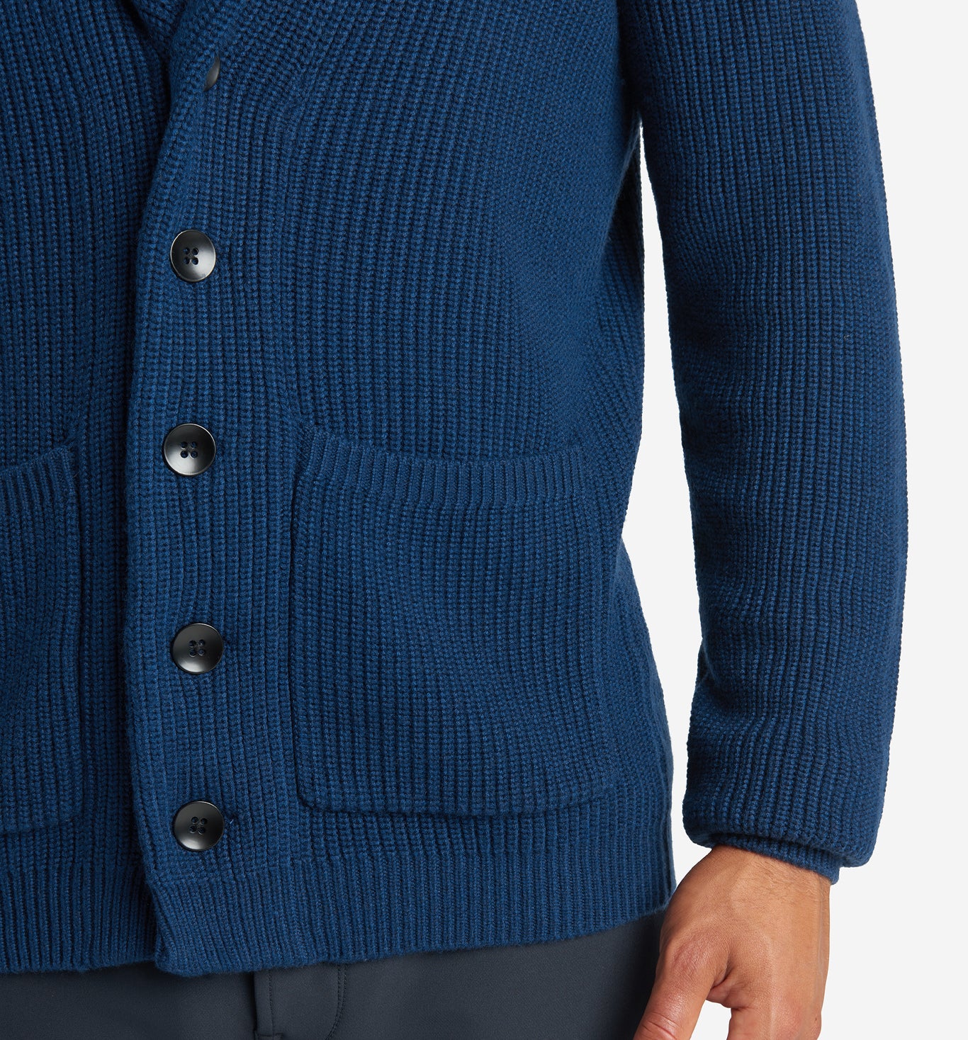 A long time favorite Holiday style returns in a simple but substantial pearl stitch sweater knit. A traditional cardigan featured in a mid-weight wool blend gets a modern makeover with our matte black metal buttons.