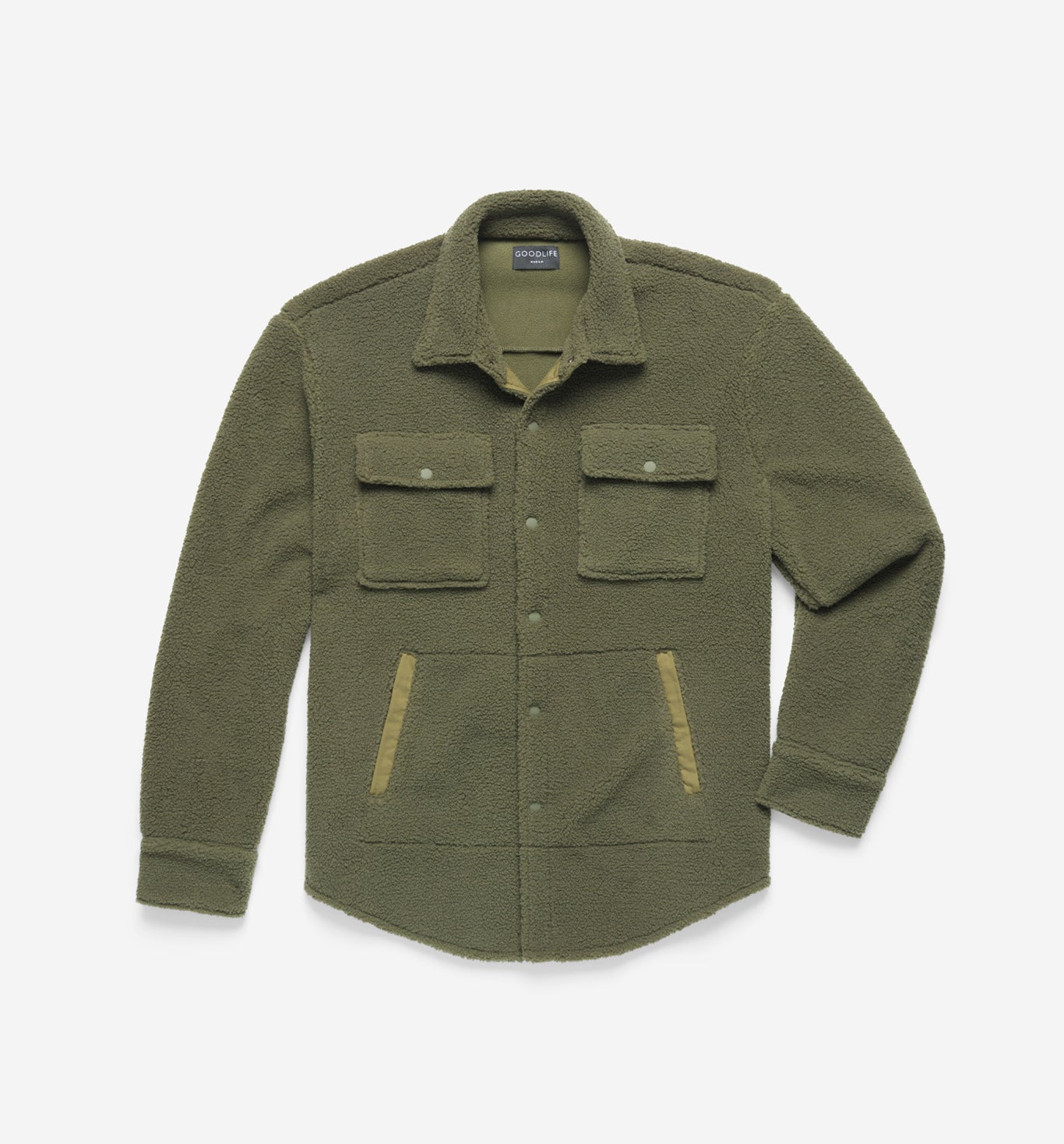 The Goodlife shirt jacket now available in a super dense, but also surprisingly lightweight thick pile sherpa. Dyed to match poplin trims create high and low details and finished with matte rubber snaps.