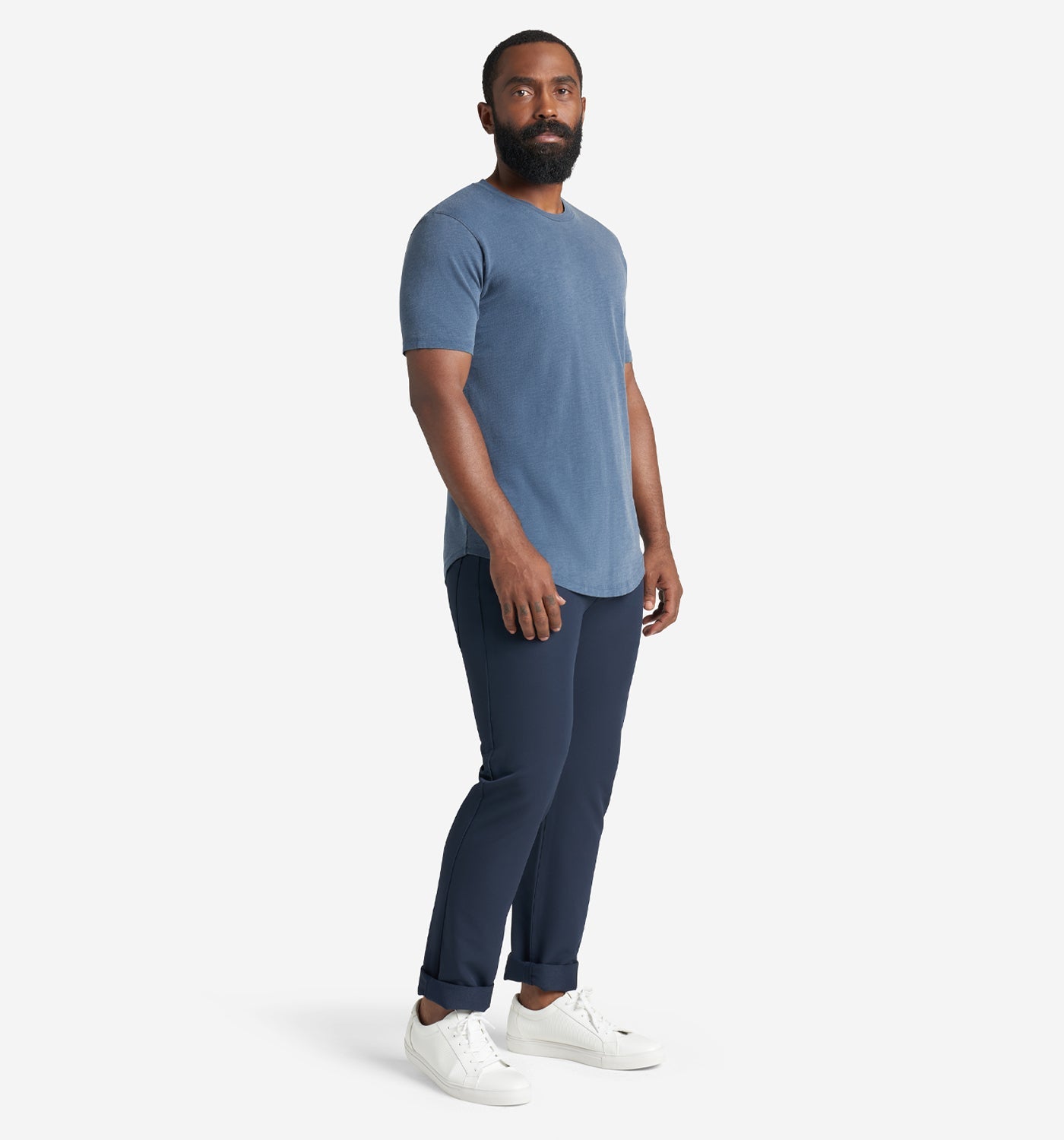 Our sun-faded slub is back and here to stay. Pigment dyed to give a washed and worn in look that will continue to soften and fade, available in our signature scallop crew. This cotton slub is now firmly planted as one of our core fabrics. These midweight cotton yarns have an intentional uneven texture that only improve with age. The perfect heavier weight option to our supima and tri-blend jerseys.
