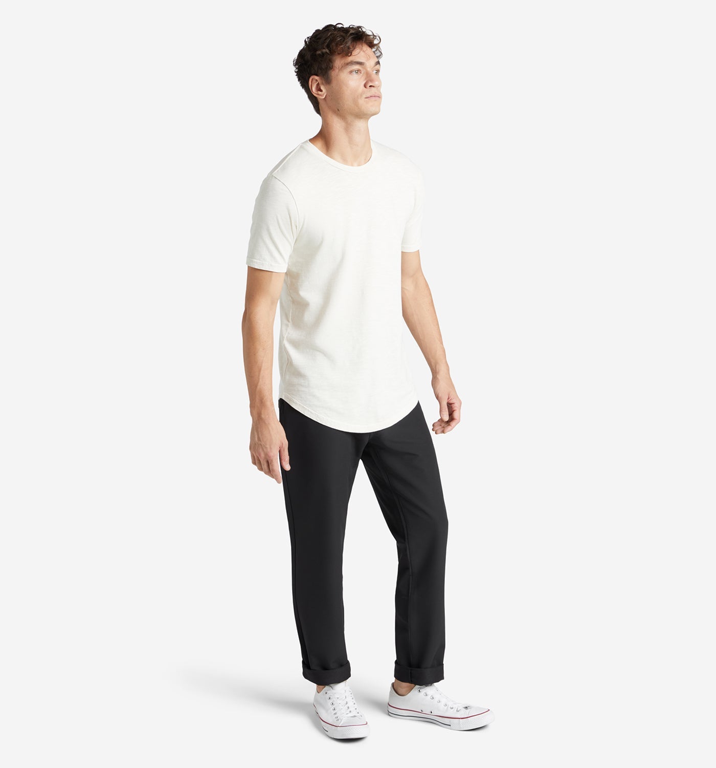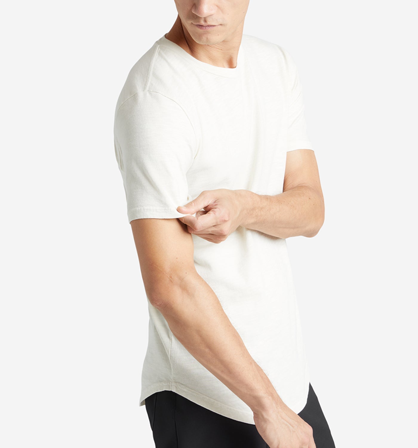 Our sun-faded slub is pigment dyed to give a washed and worn in look that will continue to soften and fade. Shown in our signature scallop crew. These midweight cotton yarns have an intentional uneven texture that only improve with age. The perfect heavier weight option to our supima and tri-blend jerseys.