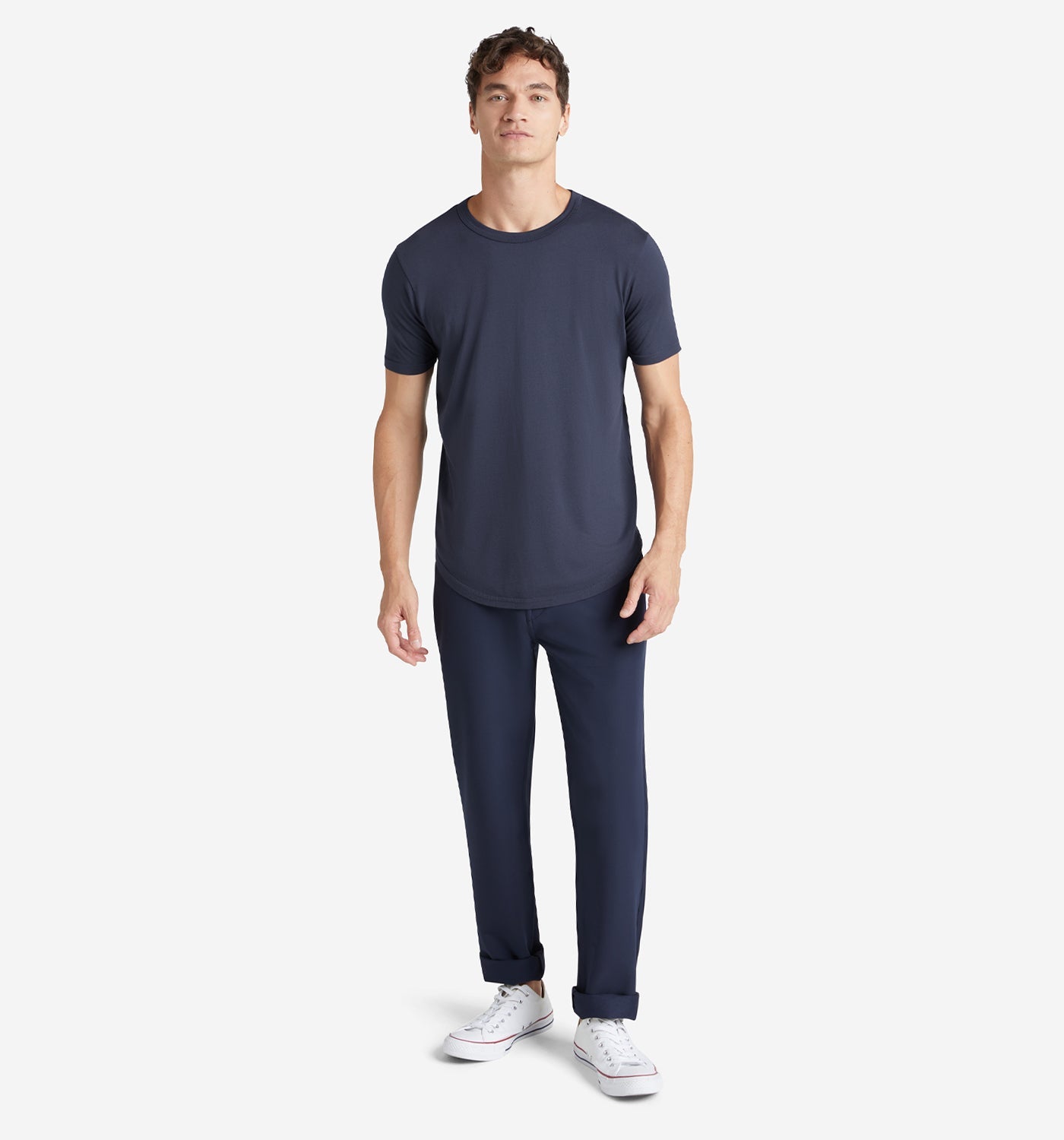 Crew neck body in short sleeve with a scalloped or curved hem detail. American grown pima cotton is blended with modal to help the garment keep its shape. Incredibly soft, a flattering drape and deep color makes this fabric versatile and sophisticated.