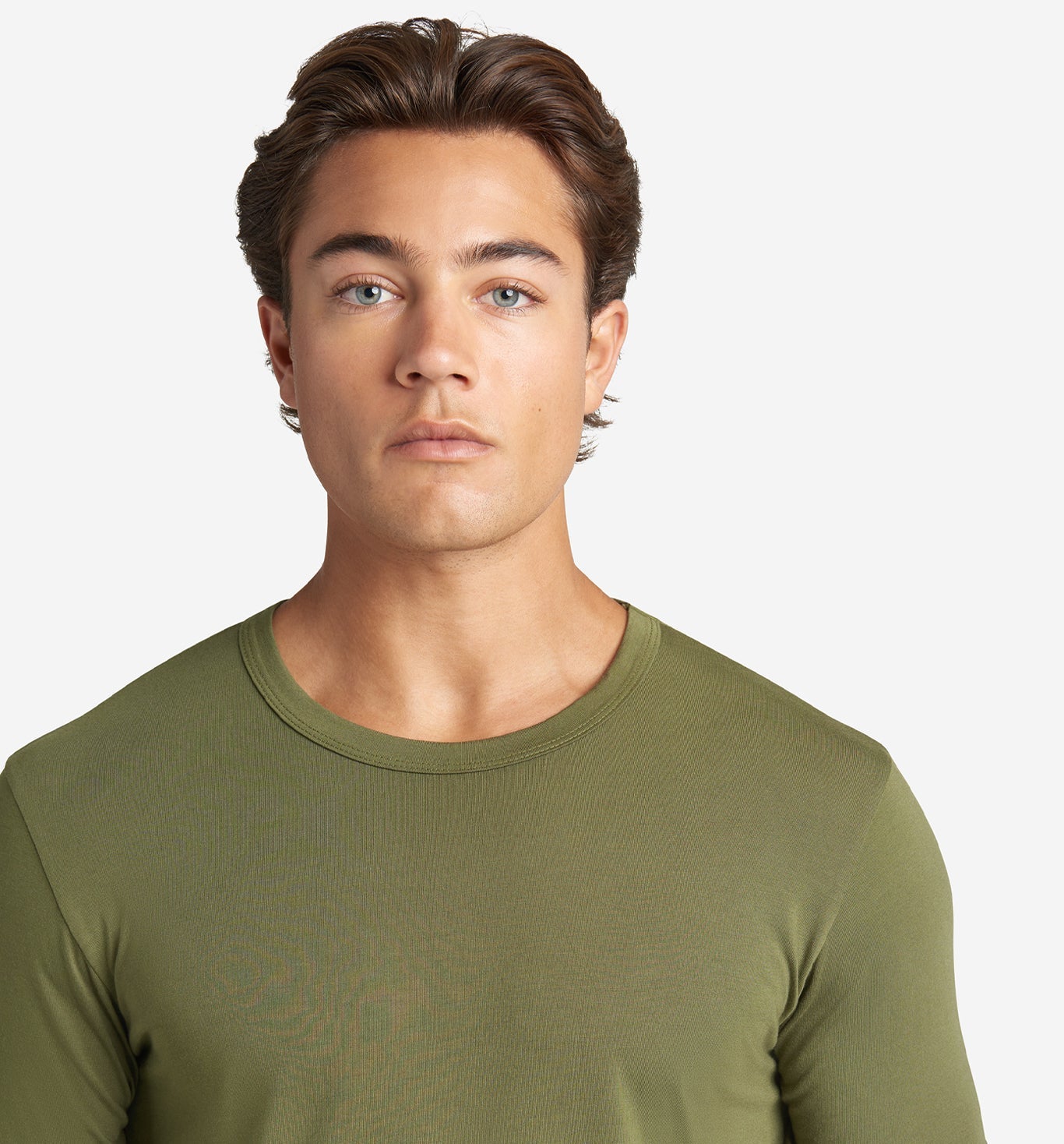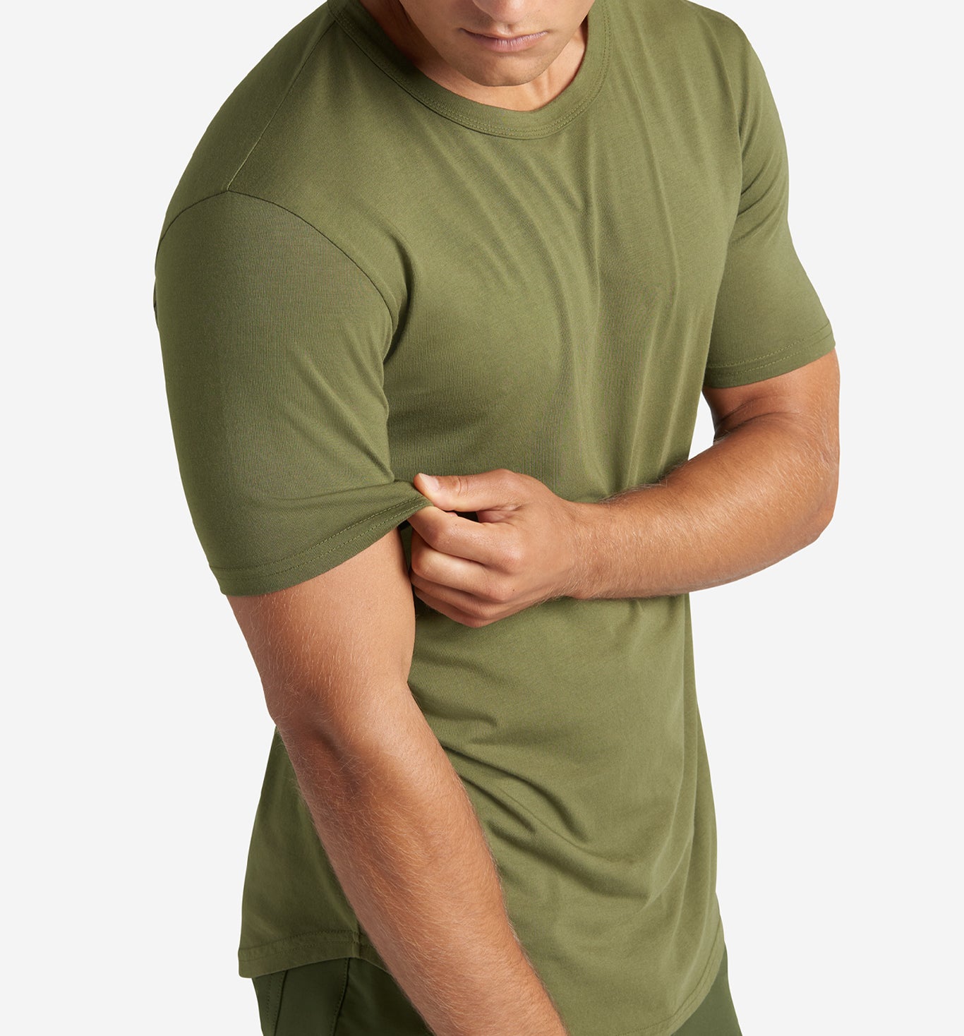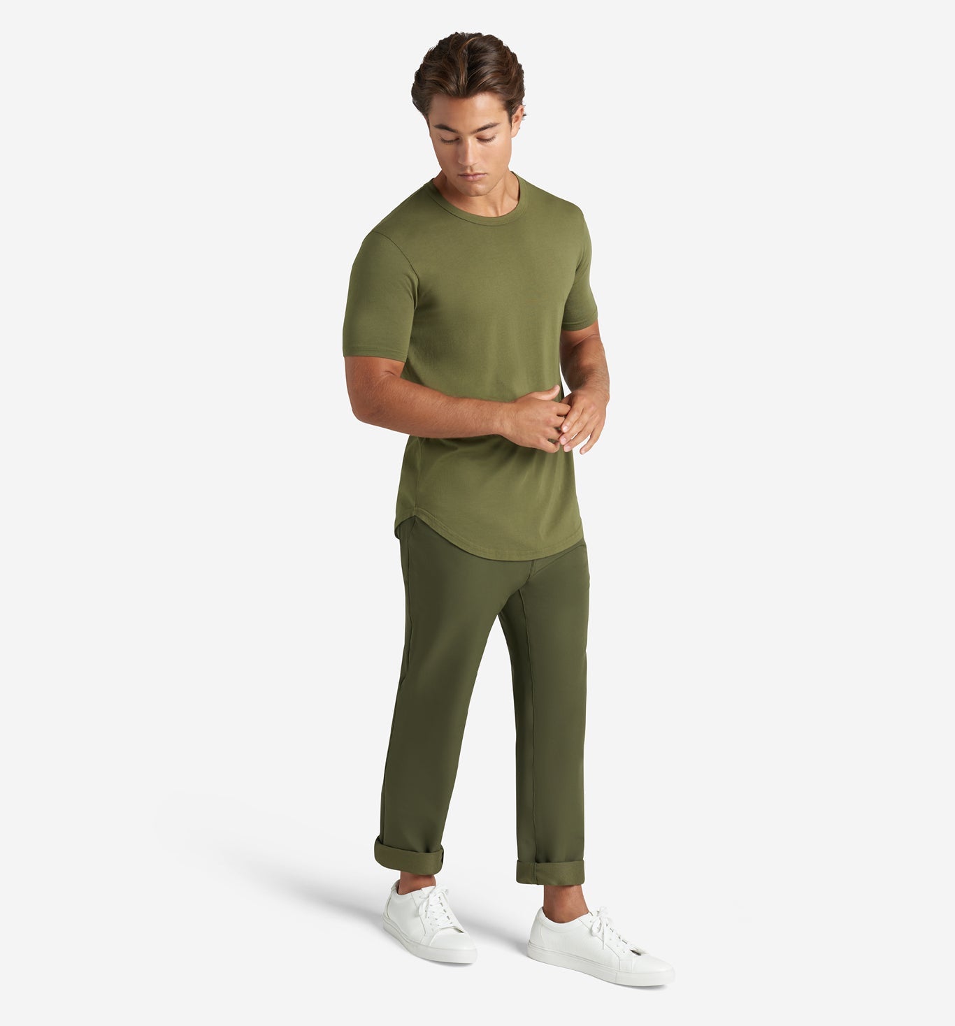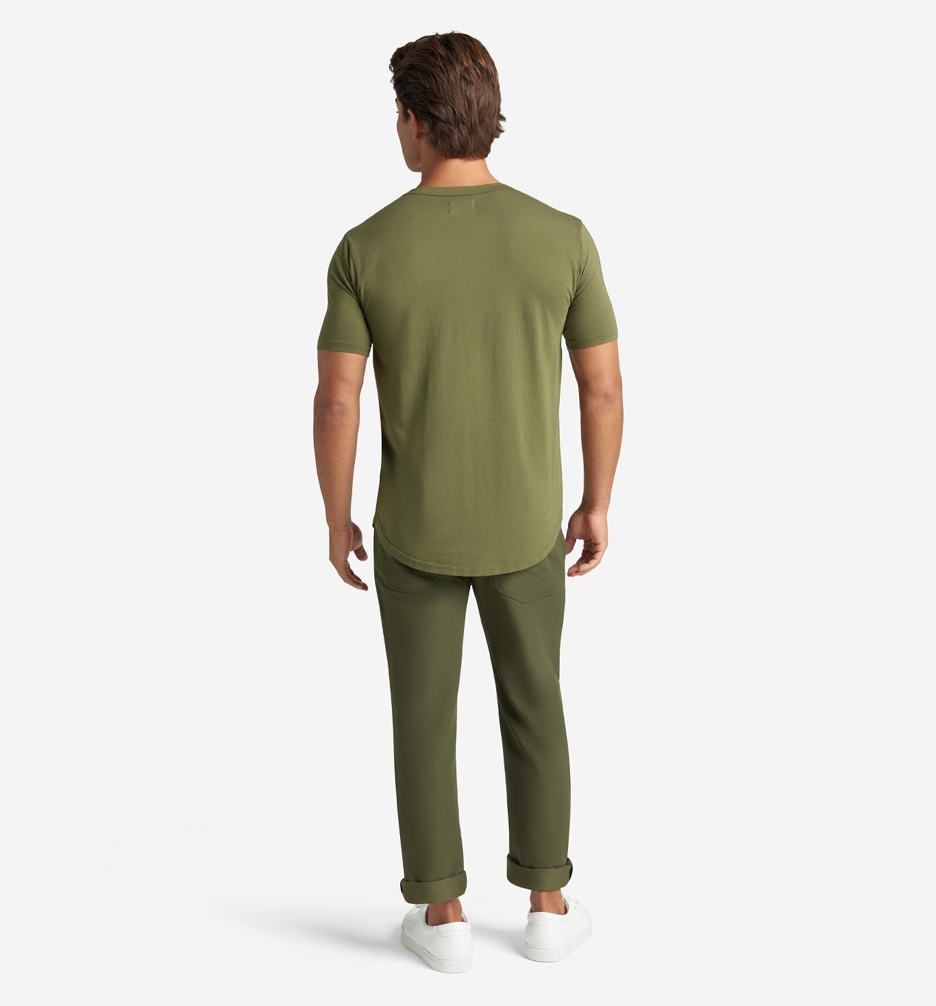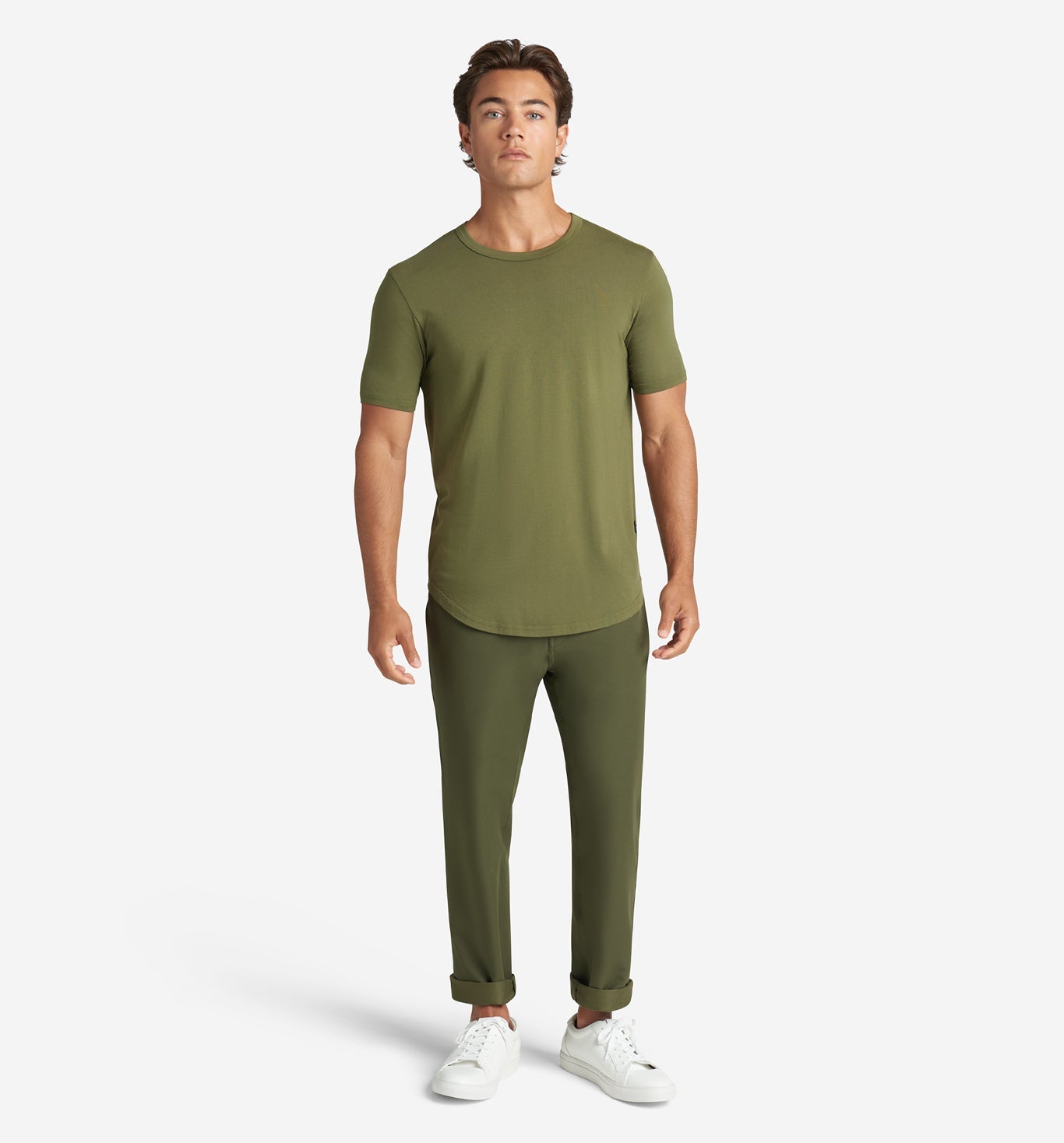 Crew neck body in short sleeve with a scalloped or curved hem detail. American grown pima cotton is blended with modal to help the garment keep its shape. Incredibly soft, a flattering drape and deep color makes this fabric versatile and sophisticated.