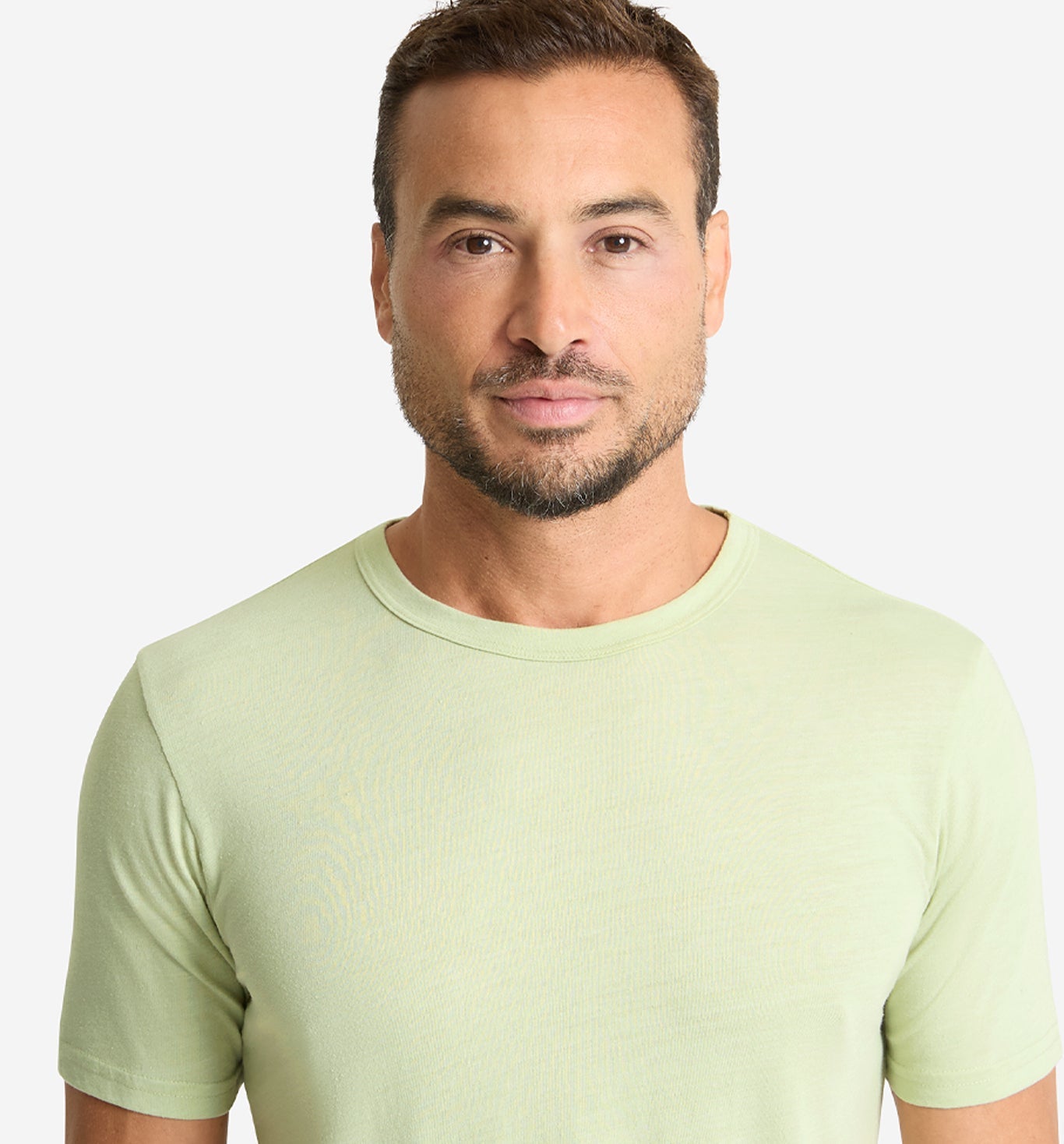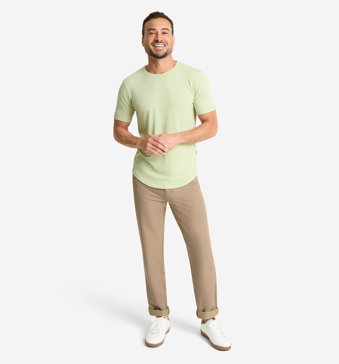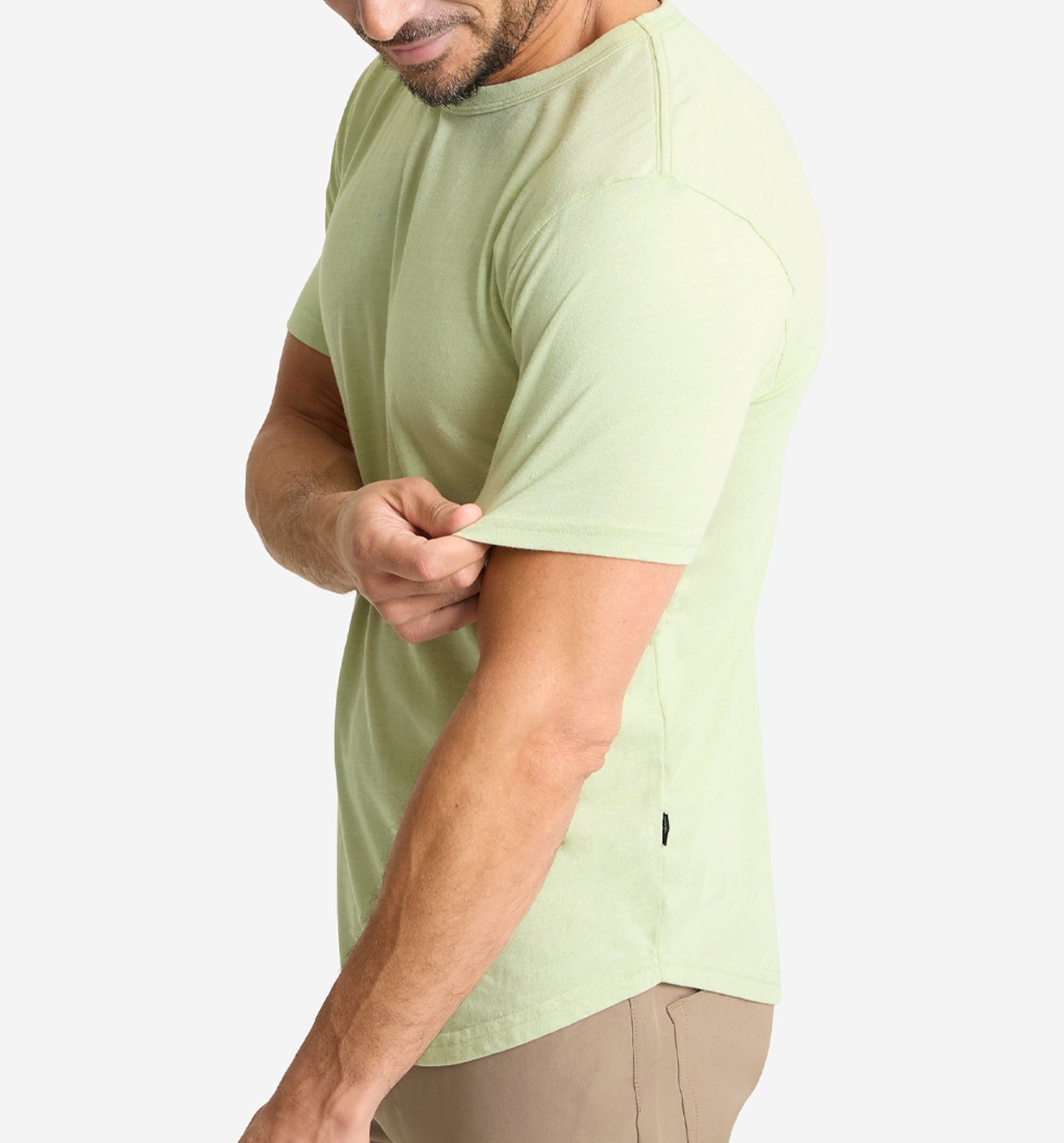 Crew neck body in short sleeve with a scalloped/curved hem detail made from our most durable jersey, while also being soft and lightweight. The blend of poly, cotton and rayon yarns give it its high-low color profile while always retaining its shape, wash after wash.